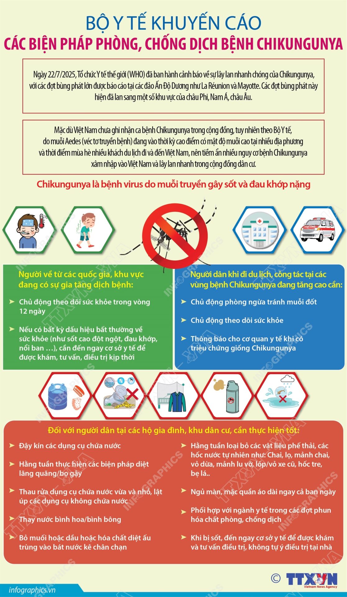 Ngày 10/8/2025, Bộ Y tế cho biết hiện nay, dịch bệnh Chikungunya đang có xu hướng gia tăng tại một số quốc gia trong khu vực. Tổ chức Y tế thế giới (WHO) ngày 22/7/2025 đã ban hành cảnh báo về sự lây lan nhanh chóng của Chikungunya, với các đợt bùng phát lớn được báo cáo tại các đảo Ấn Độ Dương như La Réunion và Mayotte.