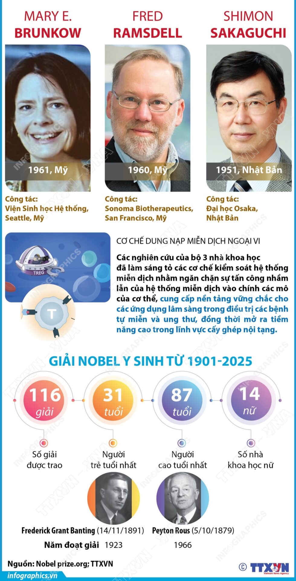 Ngày 6/10/2025 (giờ Việt Nam), Hội đồng Nobel tại Viện Karolinska ở thủ đô Stockholm của Thụy Điển công bố giải Nobel Y sinh năm 2025 thuộc về 3 nhà khoa học Mary E. Brunkow, Fred Ramsdell và Shimon Sakaguchi vì những khám phá của họ liên quan cơ chế dung nạp miễn dịch ngoại vi.