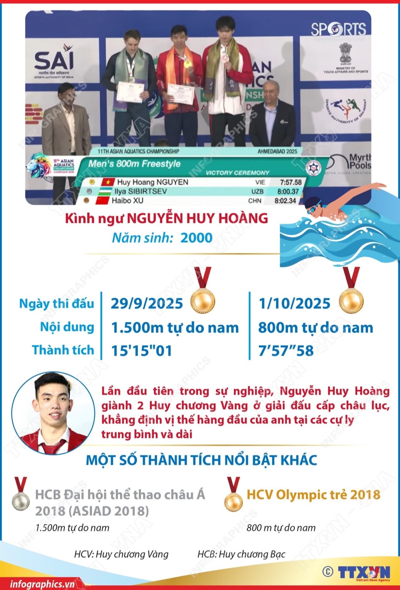 Trong các ngày 29/9 và 1/10/2025, tại Giải vô địch bơi lội châu Á 2025 diễn ra ở Ấn Độ, từ ngày 28/9 – 2/10/2025, kình ngư số 1 Việt Nam Nguyễn Huy Hoàng đã lập nên kỳ tích khi giành 2 tấm Huy chương Vàng ở các nội dung 1.500 m và 800 m tự do nam.