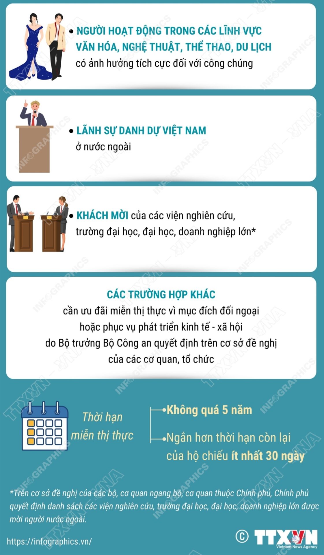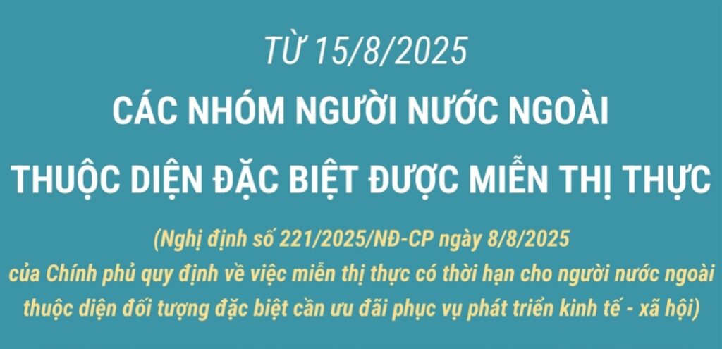Ngày 8/8/2025, Chính phủ ban hành Nghị định số 221/2025/NĐ-CP quy định về việc miễn thị thực có thời hạn cho người nước ngoài thuộc diện đối tượng đặc biệt cần ưu đãi phục vụ phát triển kinh tế – xã hội. Thời hạn miễn thị thực không quá 5 năm và ngắn hơn thời hạn còn lại của hộ chiếu ít nhất 30 ngày.