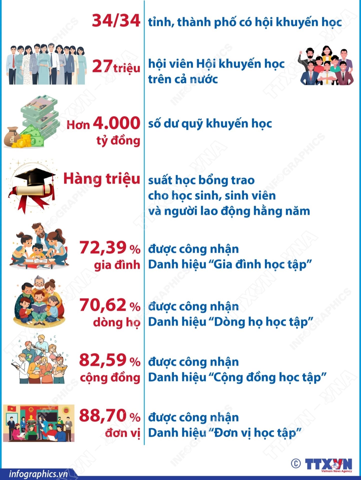 Từ ngày thành lập 29/2/1996, Hội Khuyến học Việt Nam đã trở thành lực lượng nòng cốt trong việc khuyến khích, hỗ trợ, liên kết để thúc đẩy phong trào học tập thường xuyên, học tập suốt đời, mở rộng cơ hội học tập cho mọi tầng lớp nhân dân, góp phần hiện thực hóa mục tiêu xây dựng xã hội học tập.